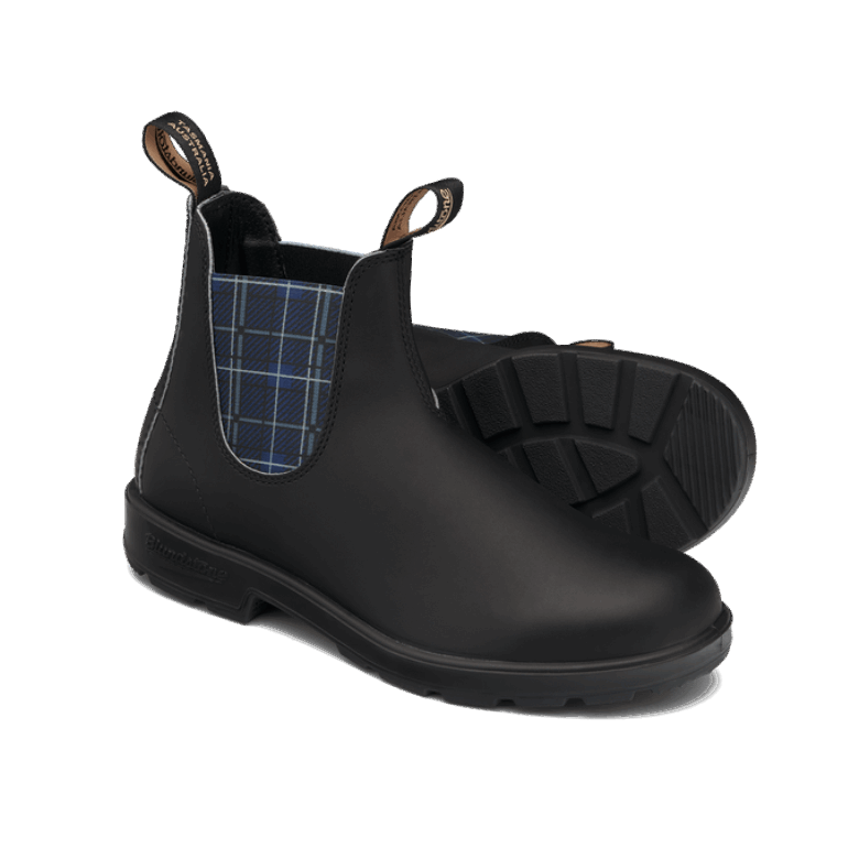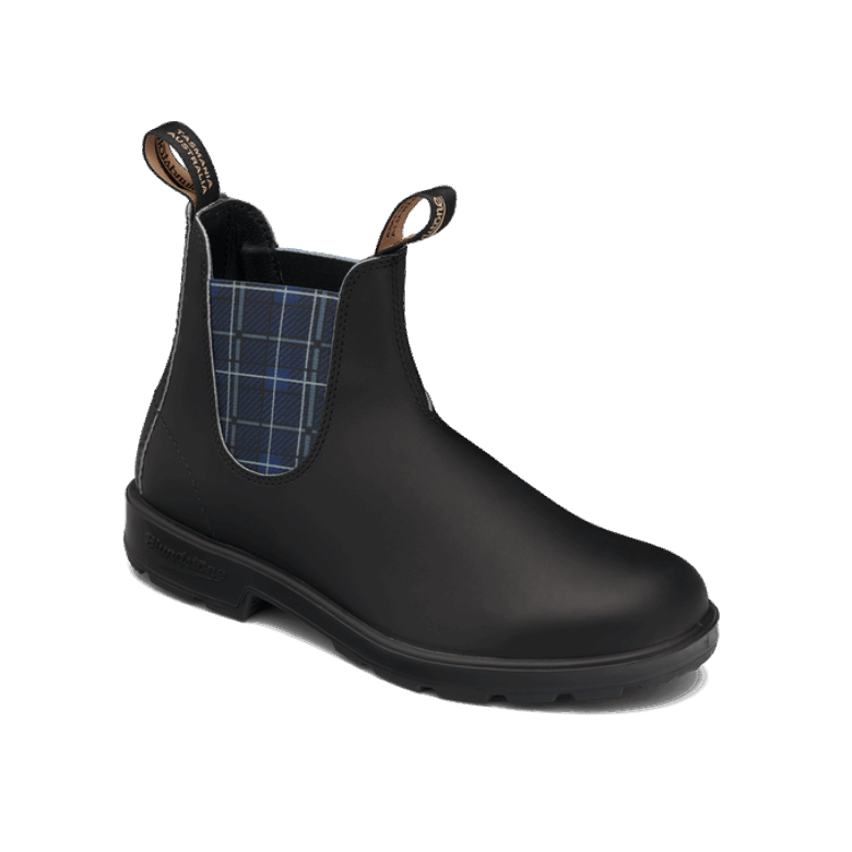 blundstone 2102 Série Originale En Noir Avec élastique Tartan Bleu Marine. C'est Le Confort D'une Botte Blundstone Sèche, Toutes Surfaces, Toutes Saisons Et à Temps Plein. Le Noir Avec Un élastique Tartan Bleu Marine Fait Des Heures Supplémentaires - éliminant Les Lacets! Taille Unisexe.